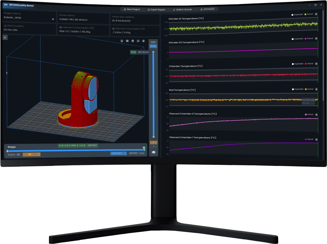 为了满足更高标准的工业生产需求,310 APOLLO同步搭载全新发布的INTAMQualityTM质量追溯系统。该系统记录从线材来源、打印参数到全过程运行数据,为每一件打印件生成独一无二的数据履历,实现真正意义上的打印可追溯、质量可验证。无论是用于认证交付,还是多设备协同打印,INTAMQualityTM都为企业提供跨批次、跨工位的一致性保障。